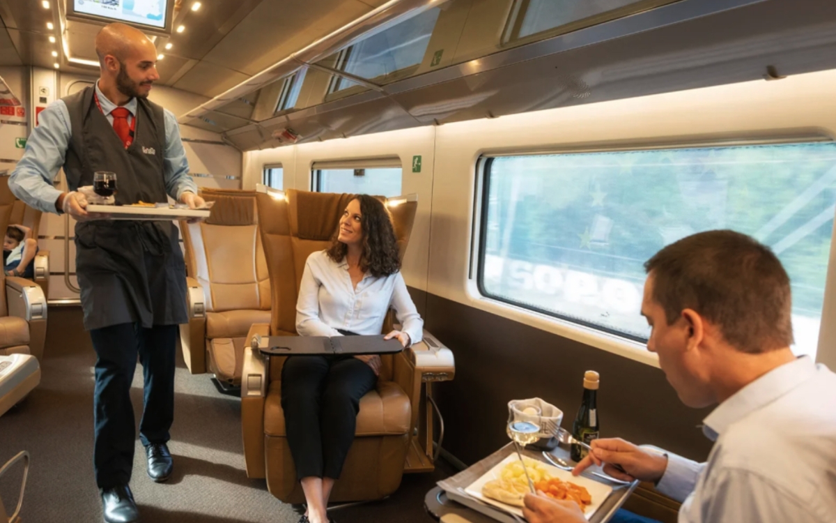 When you book with Railbookers, you have the option to upgrade to Executive Class for a truly elevated experience. Railbookers handles all the details—from ticket reservations to seat selection—ensuring your Executive Class journey includes dedicated platform staff, a personal steward, plush rotating armchair seating, and complimentary gourmet meals and drinks tailored to the time of day. You'll also enjoy exclusive access to FRECCIALounge or FRECCIACLub at major train stations before departure. Whether you're celebrating a special occasion or simply want to travel in unmatched comfort, Railbookers makes it easy to enjoy the highest level of luxury on Italy’s fastest trains.